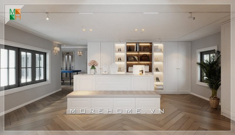 Thiết kế phòng thay đồ rộng thoáng với nội thất tủ âm tường hiện đại sang trọng có phần kết hợp giữa gỗ và kính ấn tượng để trưng bày túi xách, phụ kiện.